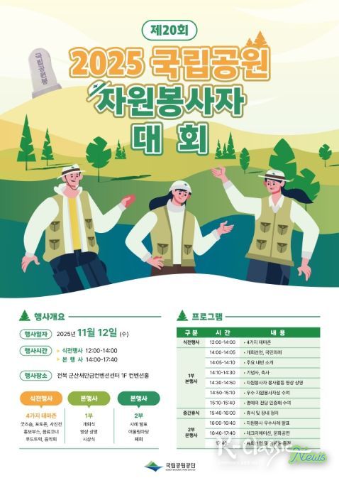 K-Classic News 기자 | 기후에너지환경부 산하 국립공원공단은 11월 12일 군산새만금컨벤션센터(군산 오식도동 소재)에서 제20회 국립공원 자원봉사자대회를 개최한다고 밝혔다.
