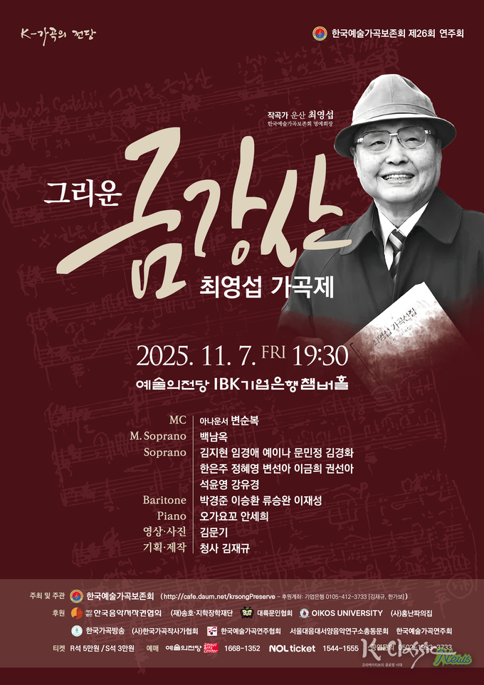 2025년 11월 7일(금) 저녁 7시 30분, IBK챔버홀의 공기는 어느 날보다 맑고 투명했다. 작곡가 최영섭을 기리는 이번 무대는 우리 가곡을 세상에 알리고자 평생을 바친 최영섭 작곡가(700여 곡 작곡)의 업적을 기리는 각별한 자리였다. 특히 그의 대표곡이자 국민가곡이된 〈그리운 금강산>은 한국 가곡사와 함께 ‘불멸의 선율’로 기억되고 있으며, 분단의 아픔과 조국 산천에 대한 그리움을 담아낸 명곡이다. 그동안 최영섭 작곡가는 90평생을 오롯이 음악에 헌신했다. 그는 어느 새 우리 가곡사의 산증인이자, 후배 음악가들의 존경을 한몸에 받는 존재가 되었다.
