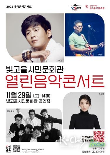 K-Classic News 기자 | 광주문화재단은 오는 11월 29일 빛고을시민문화관 공연장에서 ‘2025 대중음악콘서트(2회차)’를 전석 무료로 개최한다고 밝혔다. 이번 공연은 시민 문화복지 실현과 문화 접근성 확대를 위한 열린 음악회로, 지역민 누구나 부담 없이 참여할 수 있는 공공기획 공연이다.