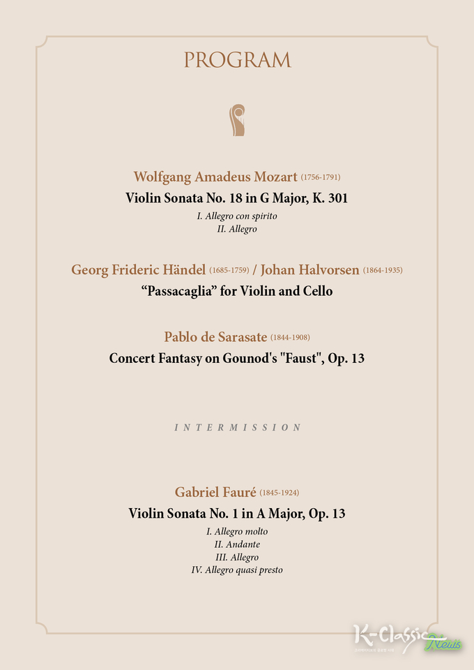 이번 독주회는 모짜르트의 Violin Sonata No. 18 in G Major, K. 301, 헨델의 Passacaglia for Violin and Cello, 사라사테 Concert Fantasy on Gounod’s “Faust”, Op. 13, 포레의 Violin Sonata No. 1 in A Major, Op. 13으로 구성되어있어 그녀의 학구적인 면모와 끊임없는 열정을 그대로 녹여낼 예정이다.