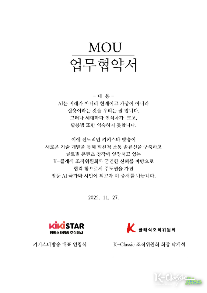 AI는 미래가 아니라 현재이고 가상이 아니라 실용이라는 것을 우리는 잘 압니다. 그러나 세대마다 인식차가 크고, 활용법 또한 익숙하지 못합니다. 이에 선도적인 키키스타 방송이 새로운 기술 개발을 통해 혁신적 소통 솔류선을 구축하고, 글로벌 콘텐츠 창작에 앞장서고 있는 K-클래식 조직위원회와 굳건한 신뢰를 바탕으로 협력 함으로서 주도권을 가진 일등 AI 국가와 시민이 되고자 이 증서를 나눕니다.