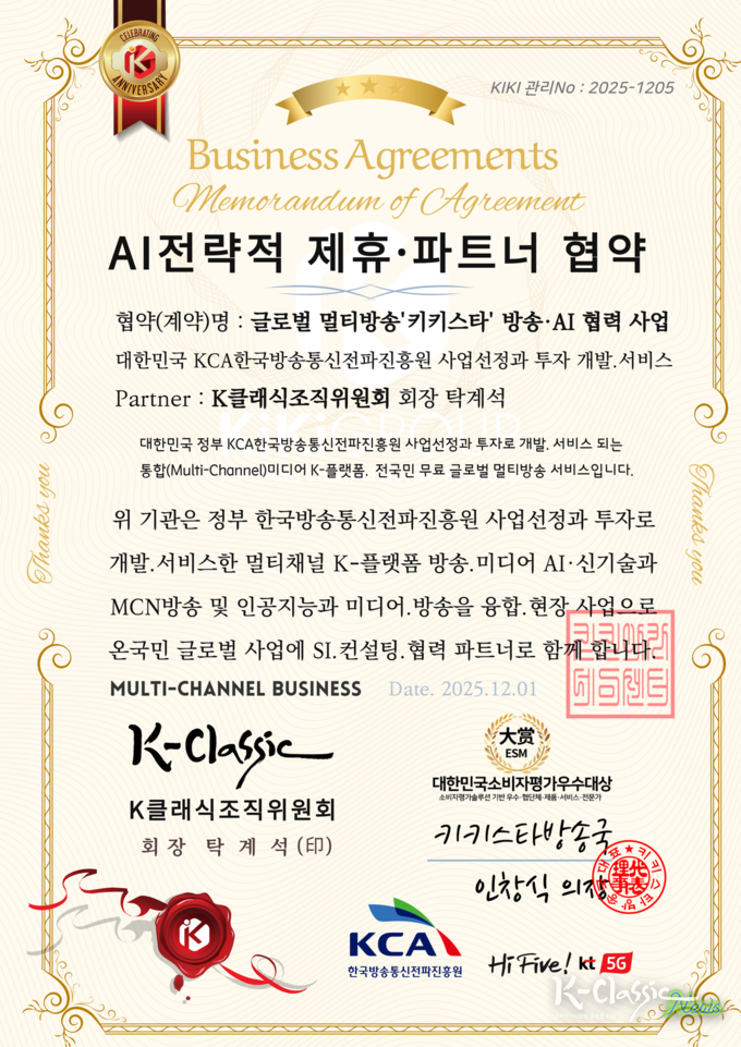 AI는 예술을 대체하지 않는다. AI는 예술가의 손과 마음을 확장하는 도구이고, 한국의 문화 경쟁력을 세계에 증폭시키는 엔진이다. 키키스타 방송 AI와 K-Classic의 협업은 단지 새로운 시스템 구축이 아니라 한국 예술의 미래 생태계를 설계하는 역사적 출발점이 될 것이다.