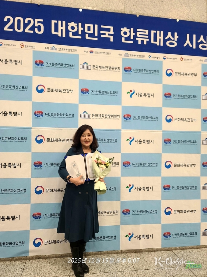 귀하께서는 지난 30년간 우리 민족의 정서와 역사를 독창적인 음악 세계로 승화시켜 오신 K-클래식의 대표 작곡가로서, 탁월한 작품성으로 한국 창작 음악의 우수성을 세계에 알리며 한류의 지평을 넓히시고 대한민국 순수예술의 위상과 국격을 드높이신 공이 크기에 "2025 대한민국한류대상 순수문화대상 음악 부문 상장과 상패를 드립니다.