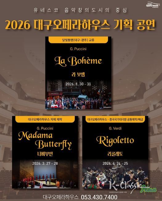 2026년 상반기에 대구오페라하우스는 푸치니 오페라 '라 보엠', '나비부인' 그리고 베르디 오페라 '리골레토'로 관객들을 만난다. 이어서 하반기에 있을 ‘제23회 대구국제오페라축제’는 야외 오페라를 시작으로, 지역 내 공연장들과 협력하여 폭 넓고, 다양한 무대에서 공연을 선보일 예정이다.