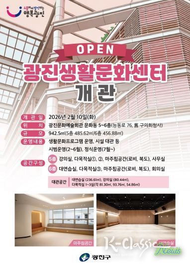 K-Classic News 기자 | 광진구는 주민 누구나 일상 속에서 문화예술 활동을 즐길 수 있는 ‘광진생활문화센터’(능동로 76)를 2월 10일 개관하고 시범 운영을 시작했다.