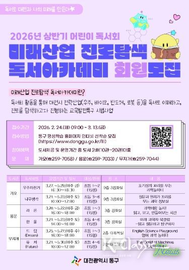 K-Classic News 기자 | 대전 동구는 지역 내 공공도서관인 가오·용운·무지개도서관에서 2026년 상반기 독서회 ‘미래산업 진로탐색 독서아카데미’를 운영하며, 이달 24일부터 참여 회원을 모집한다고 밝혔다.