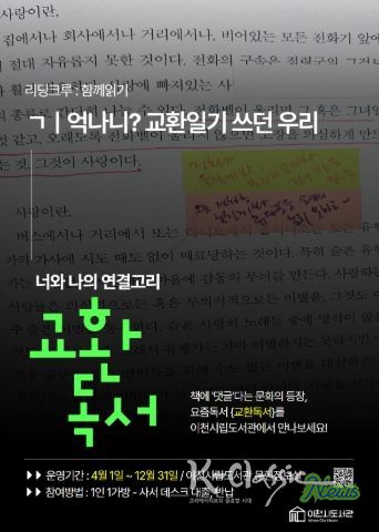 K-Classic News 기자 | 이천시립도서관은 시민들이 서로 소통하며 즐겁게 책을 접할 수 있도록, 오는 4월 1일부터 12월 31일까지 시립도서관 문헌정보실에서 ‘리딩크루’ 사업의 일환인 ‘교환독서’ 프로그램을 운영한다.