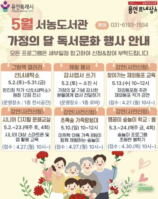 K-Classic News 기자 | 용인특례시 서농도서관은 오는 5월 가정의 달을 맞아 다양한 세대를 아우르는 프로그램으로 이뤄진 ‘2026년 5월 독서문화행사’를 마련했다고 21일 밝혔다.