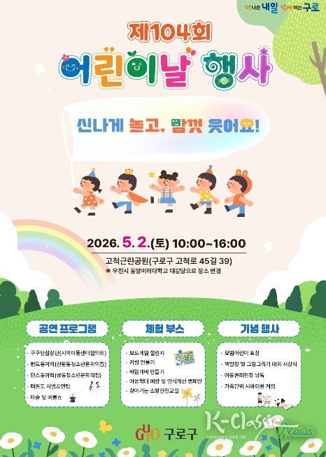 K-Classic News 기자 | 구로구가 제104회 어린이날을 맞아 오는 5월 2일 고척근린공원에서 어린이와 가족, 지역주민이 함께 즐길 수 있는 ‘어린이날 행사’를 개최한다.