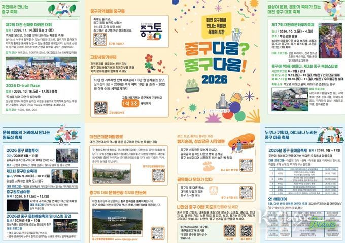 2026년 한 해 동안 열리는 10개 축제는 문화, 예술, 역사, 체육 등 다양한 주제로 채워진다. 대전을 대표하는 ▲대전효문화뿌리축제(10월2일~4일)를 비롯해 ▲중구 원도심야행(9월11일~13일) ▲제3회 중구 북페스티벌(9월12일~13일, 10월10일~11일) ▲제2회 중구 미술축제(9월30~10월12일) ▲D-Trail Race(10월16일~17일) ▲신채호 마라톤(11월 중) 등이 봄부터 늦가을까지 이어질 예정이다.