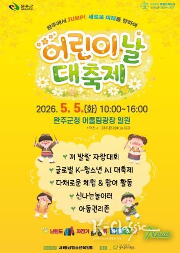 이종훈 군수 권한대행은 “이번 축제는 완주의 아이들이 더 높이 점프할 수 있도록 정성껏 준비한 무대”라며 “5월 5일, 완주군청 어울림광장에서 우리 어린이들이 주인공이 되어 새로운 미래를 향해 힘차게 날아오르길 기대한다”고 말했다.