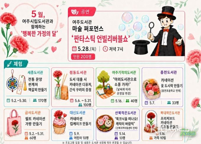 공연 프로그램으로는 여주도서관에서 마술 퍼포먼스 ‘판타스틱 언빌리버블쇼’가 오는 5월 28일 오후 7시에 개최된다. 이번 공연은 환상적인 마술과 흥미로운 연출을 통해 관람객에게 색다른 문화 경험을 제공할 것으로 기대된다. 체험 프로그램도 도서관별로 다양하게 마련하여 세종도서관에서는 ‘전통 문양 썬캐쳐 책갈피 만들기’를 5월 2일부터 30일까지 운영하며, 점동도서관에서는 도서 대출 이용자를 대상으로 카네이션 디퓨저와 간식 꾸러미를 제공하는 이벤트를 5월 6일부터 31일까지 진행한다.