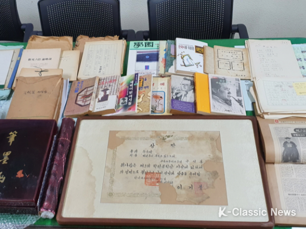 K-Classic News 조연정 기자 | 충북 영동군 출신의 대표적인 문인이자 전설 따라 삼천리를 집필한 방송작가로도 유명한 故 구석봉(具錫奉) 시인의 배우자 배우 최선자(79세) 씨가 구석봉 시인의 육필원고 등 문학자료 339점을 영동군에 기증했다.