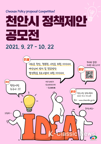 K-Classic News 조연정 기자 | 천안시가 ‘새로운 천안, 행복한 시민을 위한 아이디어’외 2개 주제로 2021 하반기 천안시민 정책제안 공모전을 실시한다.