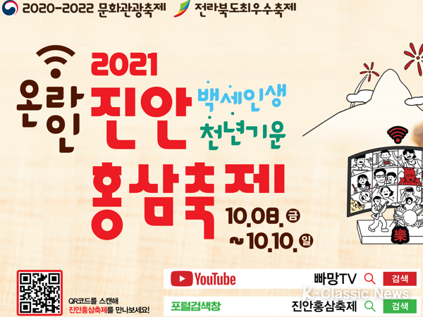 K-Classic News 조연정 기자 | 진안홍삼축제추진위원회는 오는 10월 8일~10일까지 3일간 온라인 축제로 열리는 ‘2021 온라인 진안홍삼축제’ 프로그램 참가 사전접수를 9월 27일부터 진안홍삼축제 홈페이지에서 신청받고 있다고 밝혔다.