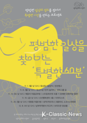 K-Classic News 조연정 기자 | 영도문화도시센터는 오는 11월 1일 첫 회 공연을 시작으로 총 여섯 차례 찾아가는 문화공연을 통해 새벽시장 상인, 마을공부방 아이들, 대중교통운수업 종사자 등 평범한 일상의 주민과 만나는 '특별한 60분' 프로젝트를 추진한다.