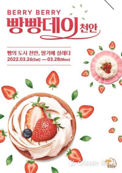 K-Classic News 조연정 기자 | 천안지역 친환경 농산물 천안 딸기로 만든 건강한 빵을 맛볼 수 있는 ‘베리(Berry) 베리(Berry) 빵빵데이’ 축제가 3일 앞으로 다가왔다.