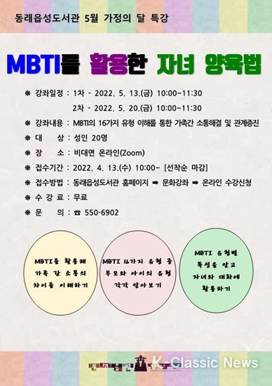 K-Classic News 최태문 기자 | 부산 동래구(구청장 김우룡)는 5월 가정의 달을 맞이하여 동래읍성도서관에서 ‘MBTI를 활용한 자녀 양육법’ 특강을 운영한다고 밝혔다.