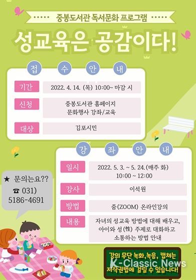K-Classic News 최태문 기자 | 김포시 중봉도서관은 가정의 달을 맞아 오는 5월 3일부터 5월 24일까지 매주 화요일 오전 10시부터 12시까지 김포시 부모들을 대상으로 "성교육은 공감이다!" 강의를 비대면 온라인 줌(ZOOM)으로 진행한다.