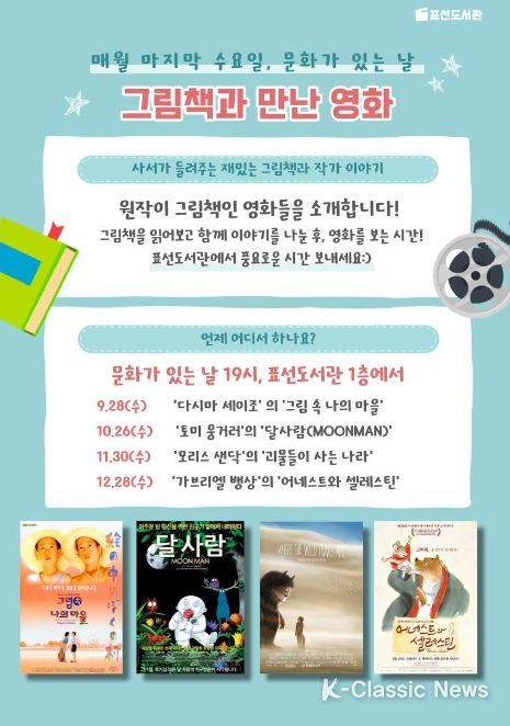 K-Classic News 최지나 기자 | 서귀포시 도서관운영사무소 표선도서관은 하반기 문화가 있는 날(매월 마지막 주 수요일)에‘그림책과 만난 영화 이야기’를 운영한다.