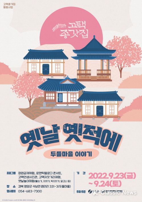 K-Classic News 최지나 기자 | 영양군은 2022년 9월 23일부터 24일 양일 간 석보면 두들마을 일원에서 고택 종갓집 활용사업인‘옛날 옛적에(부제 두들마을 이야기)’를 개최한다. 코로나19 여파로 2020년 행사가 온라인으로 진행된 이후 3년 만에 오프라인 행사로 진행된다.