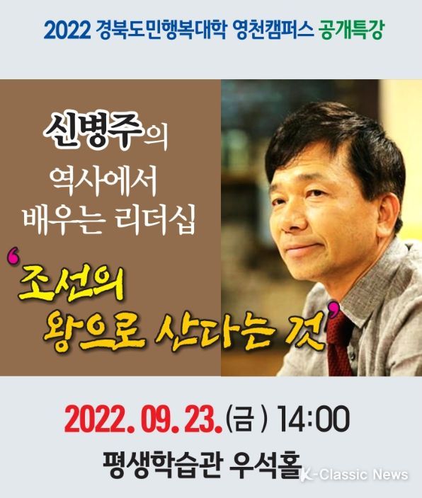 K-Classic News 최지나 기자 | 영천시와 성운대학교가 함께 운영하는 경북도민행복대학 영천캠퍼스가 오는 23일 신병주 교수를 초청해 시민 공개특강을 개최한다.
