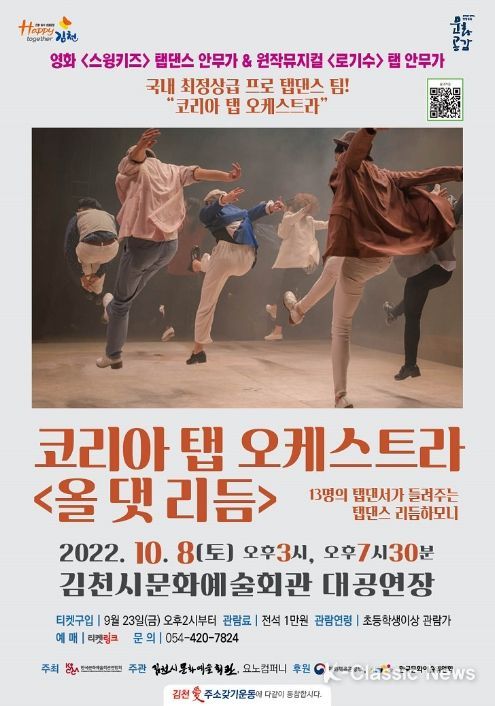 K-Classic News 최지나 기자 | 김천시 문화예술회관은 ‘2022 문예회관과 함께하는 방방곡곡 문화공감 사업’의 일환으로 코리아 탭 오케스트라‘올댓리듬’을 오는 10월 8일 오후 3시, 오후 7시 30분에 문화예술회관 대공연장에서 개최한다.