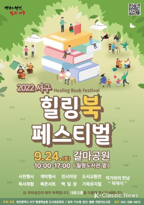 K-Classic News 최지나 기자 | 대전광역시 서구는 오는 24일 오전 10시부터 오후 5시까지 월평도서관 옆 갈마공원에서 ‘서구, 책으로 힐링하다’라는 주제로 2022 ‘서구 힐링 북 페스티벌’을 개최한다.
