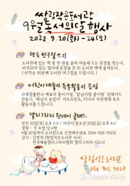 K-Classic News 최지나 기자 | 고령군 쌍림면은 9월 독서의 달을 맞아 쌍림작은도서관에서 9월 20일부터 24일 5일간 다채로운 행사를 진행한다.