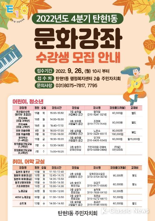 K-Classic News 최지나 기자 | 고양특례시 탄현1동 주민자치회는 고양시민을 대상으로 올해 4분기 주민자치센터 프로그램 수강생을 모집한다. 모집기간은 9월 26일부터 30일까지이며 선착순 마감이다.