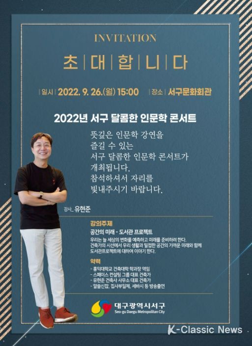 K-Classic News 최지나 기자 | 대구광역시 서구는 9월 26일 오후 3시 서구문화회관에서 도시와 건축에 대한 참신한 해석을 보여주는 건축가 유현준 교수를 초청해‘공간의 미래 – 도서관 프로젝트’ 한 주제로 인문학 강연 콘서트를 진행한다.