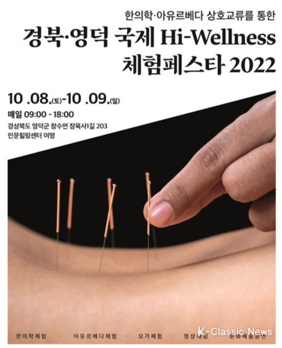 K-Classic News 최지나 기자 | 영덕군은 '경북·영덕 국제 하이웰니스 체험 페스타 2022'가 오는 10월 8일부터 9일까지 전통 자연의학을 통한 라이프스타일 헬스케어를 주제로 영덕군 창수면 인문힐링센터 여명에서 펼쳐질 예정이라고 밝혔다.