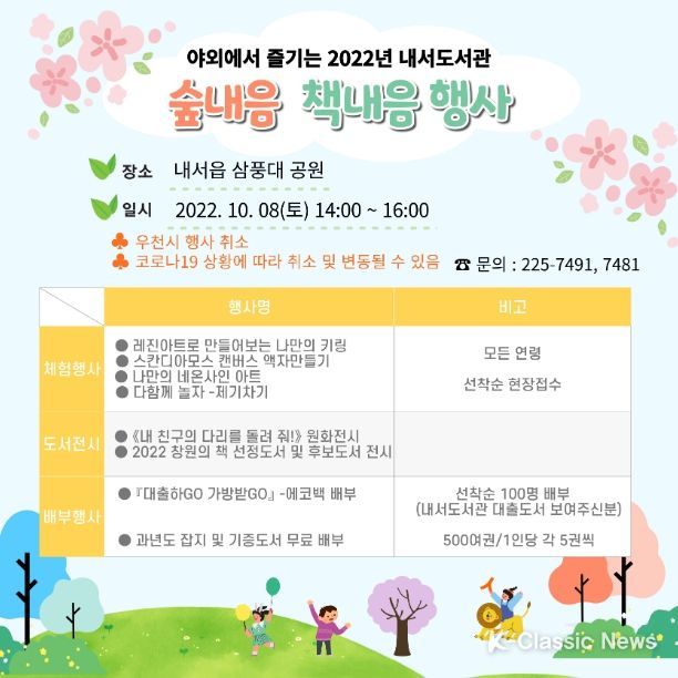 K-Classic News 최지나 기자 | 창원특례시 마산회원도서관과 내서도서관은 10월 8일 14:00부터 16:00까지 내서읍 삼풍대 공원에서 숲내음 책내음 독서문화 행사를 개최한다고 30일 밝혔다.