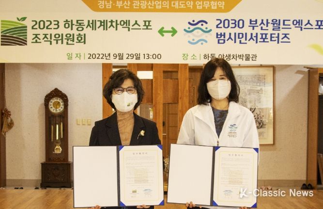 K-Classic News 최지나 기자 | 경상남도 하동세계차엑스포조직위원회는 29일 하동군 소재 야생차 박물관에서 유도희 2030부산월드엑스포 범시민 서포터즈 지회장, 박옥순 하동차엑스포조직위 사무처장, 이동진 하동군 기획행정국장 등 40여 명이 참석한 가운데, 2023하동세계차엑스포 성공개최 및 2030부산월드엑스포 유치와 관광산업 발전을 위한 업무협약을 체결했다고 밝혔다.