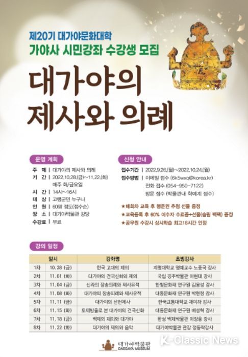 K-Classic News 최지나 기자 | 고령군 대가야박물관은 9월 26일부터 10월 24일까지 제20기 대가야문화대학(가야사시민강좌)에 참여할 수강생 60명을 모집한다.