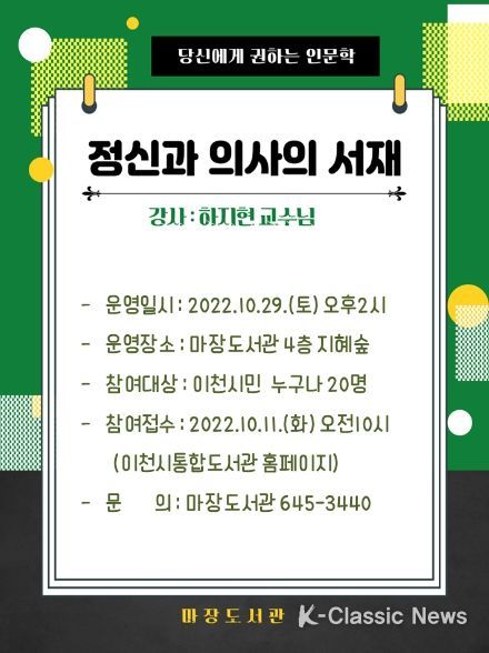K-Classic News 최지나 기자 | 이천시 마장도서관은 가을이 깊어가는 10월, 의학전문대학원 교수이면서 진료하며 읽고 쓰고 가르치는 일을 하고 있는 하지현 교수를 초청해 인문학 강연회를 개최한다고 밝혔다.