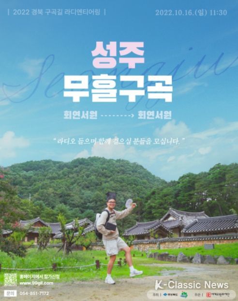K-Classic News 최지나 기자 | 성주군은 10월 16일 낮 12시부터 오후 2시까지 ‘무흘구곡 문화탐방(라디엔티어링)’을 진행한다고 밝혔다.