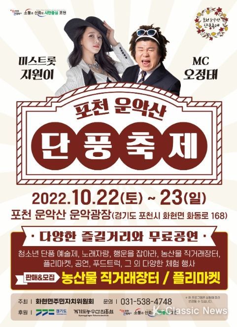 K-Classic News 최지나 기자 | 포천시는 오는 22일부터 23일까지 화현면 운악광장 일원에서 ‘다시 찾고 싶은 포천 운악산’이라는 주제로 ‘제17회 포천 운악산 단풍축제’를 개최한다.
