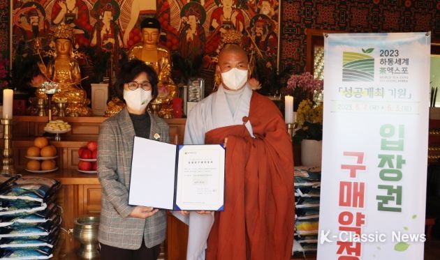 K-Classic News 최지나 기자 | (재)하동세계차엑스포조직위원회는 25일 휴심사와 2023하동세계차엑스포 성공 기원 입장권 구매 약정식을 개최했다고 밝혔다.