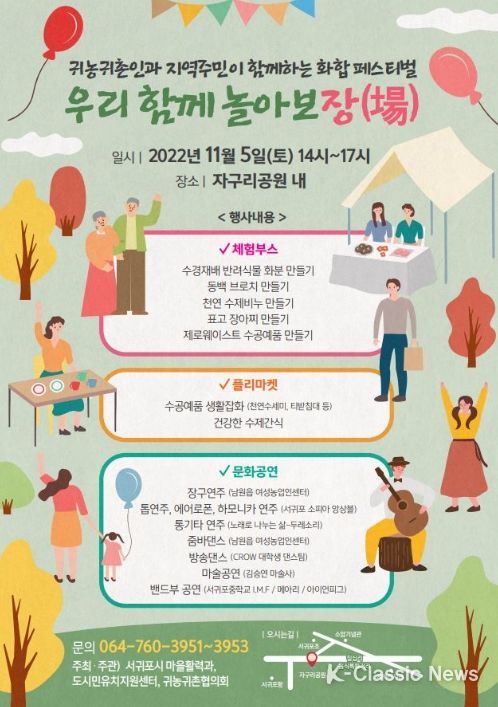K-Classic News 최지나 기자 | 서귀포시는 오는 11월 5일 14시 자구리공원 일원에서 ‘2022년 서귀포시 귀농귀촌인+지역주민 우리 함께 놀아보장(場)’행사를 개최하여 귀농·귀촌인과 지역주민과의 소통·교류의 장을 마련한다.