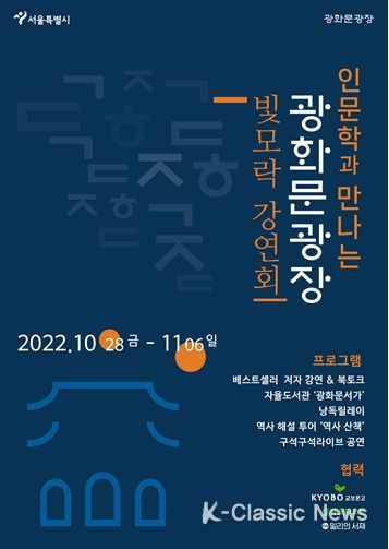 K-Classic News 박미영 기자 | 가을빛으로 물든 광화문광장에서 10월 28일부터 11월 6일까지 다양한 인문학 강좌를 만날 수 있는 ‘광화문광장 빛모락 강연회’가 열흘 동안 펼쳐진다. 건축가 유현준, 소설가 박상영, 작품 해설사(도슨트) 이창용 작가의 북콘서트와, 멋 글씨 예술가(캘리그래피 아티스트) 이상현 작가의 인생 글귀 써주기 행사, 오디오북 ‘윌라’ 성우들의 오디오북콘서트 등 다채로운 행사가 광화문광장 곳곳에서 진행될 예정이다.