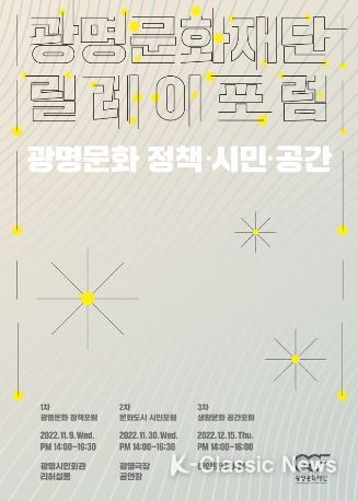 K-Classic News 박미영 기자 | (재)광명문화재단(대표이사 어연선)은 오는 11월 9일 14시 '광명문화 정책포럼'을 시작으로 광명시 지역 문화 발전을 위한 3차에 걸친 2022년 (재)광명문화재단 릴레이 포럼을 개최한다.