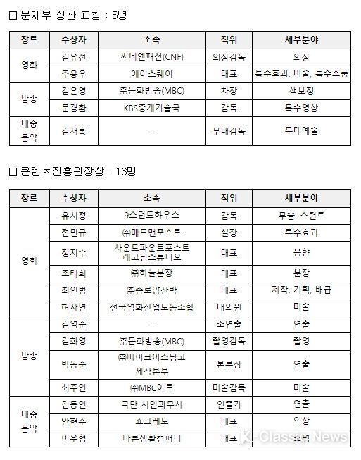 [영화·방송·대중음악 분야에서 활약한 제작진을 대상으로 문체부 장관 표창 5명, 콘진원 원장상 13명 수여]