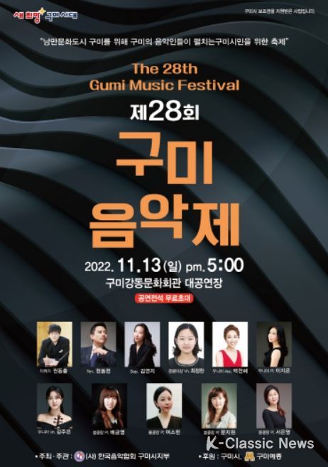 K-Classic News 최지나 기자 | 구미시는 11월 13일 오후 5시 구미강동문화복지회관에서 (사)한국음악협회 구미지부 주관으로 제28회 구미음악제를 개최한다.