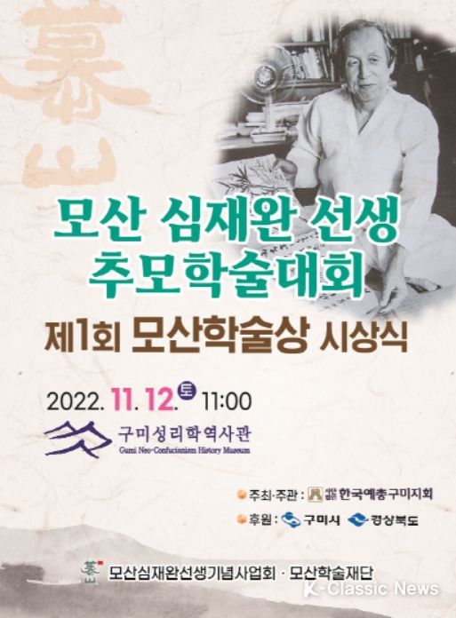 K-Classic News 최지나 기자 | 구미시는 11월 12일 오전 11시 구미성리학역사관 야은관에서 (사)한국예총 구미지회 주관으로 모산 심재완선생 추모 학술대회를 개최한다.