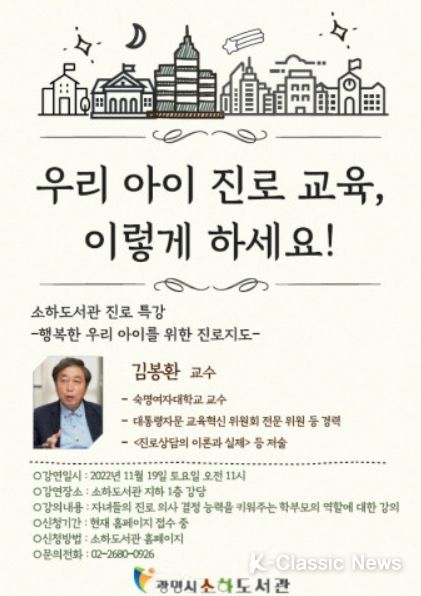 K-Classic News 최지나 기자 | 광명시 소하도서관은 19일 학부모와 학생을 위한 진로 특강 ‘우리 아이 진로 교육, 이렇게 하세요!’를 운영한다.