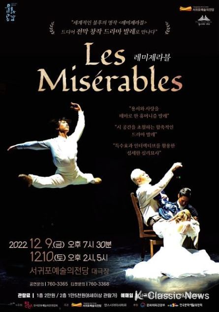 K-Classic News 최지나 기자 | 서귀포시는 창작발레 “레 미제라블”공연을 12월 9일 오후 7시30분 ~ 12월 10일 2시, 5시(2일 3회) 서귀포예술의전당 대극장에서 개최한다.