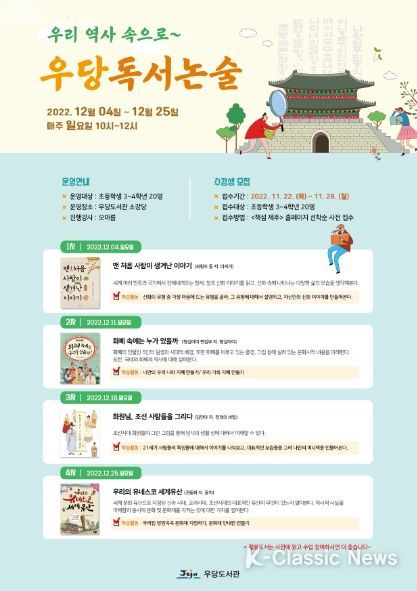 K-Classic News 최지나 기자 | 제주시 우당도서관은 초등학생을 대상으로 오는 12월 3일부터 12월 25일까지 송년 어린이 프로그램을 진행한다고 밝혔다.