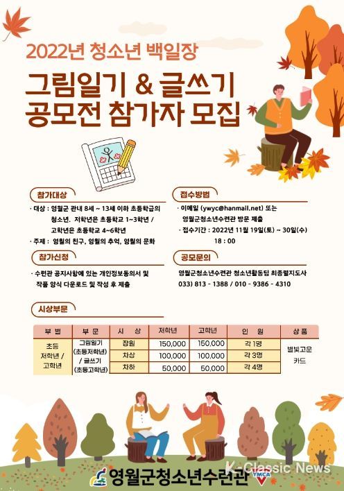 K-Classic News 최지나 기자 | 영월군청소년수련관은 19일부터 영월사랑을 키워드로 한 2022년 청소년 백일장 그림일기&글쓰기 공모전의 참가자 모집을 실시한다.