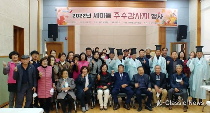 K-Classic News 최지나 기자 | 오산시 세마동 통장단협의회는 18일 세마동행정복지센터 4층 대강당에서 단체장 및 지역주민 100여 명이 참석한 가운데 ‘추수감사제’ 행사를 마쳤다고 밝혔다.